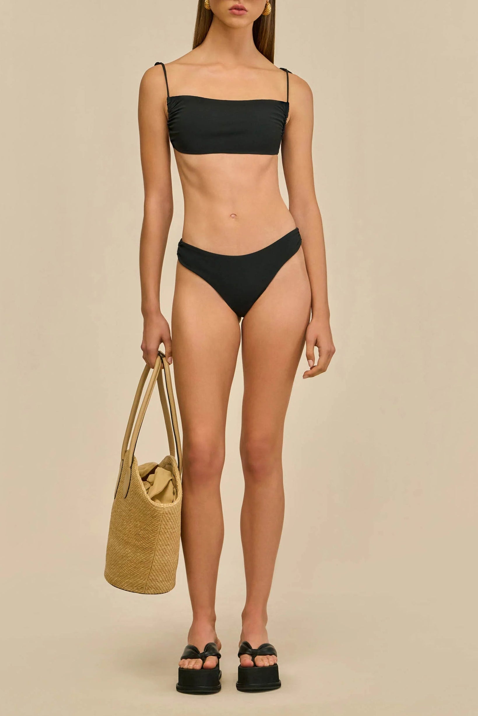 A straight-across bikini top with thin front straps that transform into calla-lillies that wrap around the shoulder.
